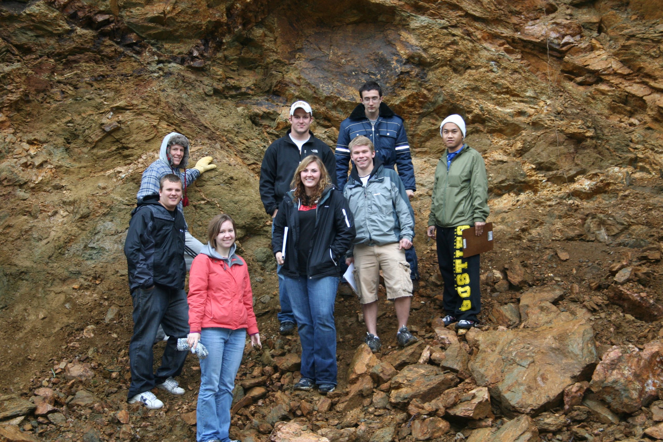 The Evolution of the Earth class (clockwise from upper left: Patrick Clark, Todd Kremmin, Joe Curran-Jung, Bee Vang, Taylor Eide, alanna Velo, Erin Anderson, and Sam Hines) cheerfully ignored drizzle, wind, and wet outcrop to travel from west to east across the southern part of the state. This transect revealed igneous, metamorphic, and sedimentary rocks ranging from the Archean beginnings of North America to post-glacial, flood-carved landscapes.